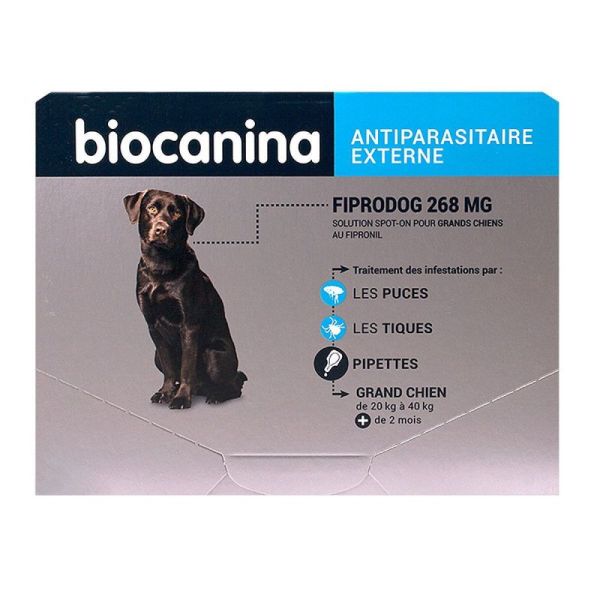 Nature de produit : Pipette Conditionnement : Pappkarton, Thermoform-Blister Indication / Contre-indication : Außerhalb der Reichweite von Kindern aufbewahren., Kontakt mit Haut, Schleimhäuten und verletzter Haut vermeiden., Nicht verschlucken, Vermeiden Sie jeglichen Augenkontakt., Veterinärmedizinische Anwendung