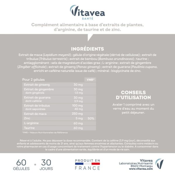 Nature de produit : Kapsel, Nahrungsergänzungsmittel Conditionnement : Pappkarton Label : Hergestellt in Frankreich Indication / Contre-indication : Außerhalb der Reichweite von Kindern aufbewahren., Die empfohlene Tagesdosis darf nicht überschritten werden., Nicht empfohlen für schwangere oder stillende Frauen